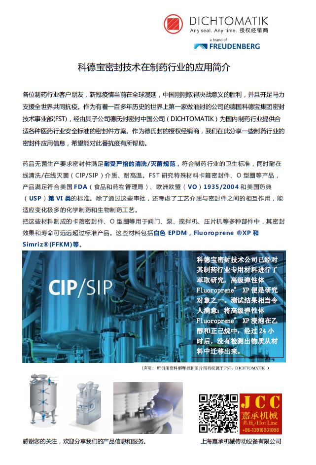 新冠疫情當前在全球漫延,中國剛剛?cè)〉脹Q戰(zhàn)意義的勝利,并且開足馬力支援全世界共同抗疫。作為有著一百多年歷史的世界上第一家做油封的公司的德國科德寶集團密封技術(shù)事業(yè)部(FST),經(jīng)由其子公司德氏封密封中國公司(DICHTOMATIK)為國內(nèi)制藥行業(yè)提供合適各種醫(yī)藥行業(yè)安全標準的密封件方案。作為德氏封的授權(quán)經(jīng)銷商,我們在此分享一些制藥行業(yè)的密封件應用信息,希望能對此番抗疫有所幫助。